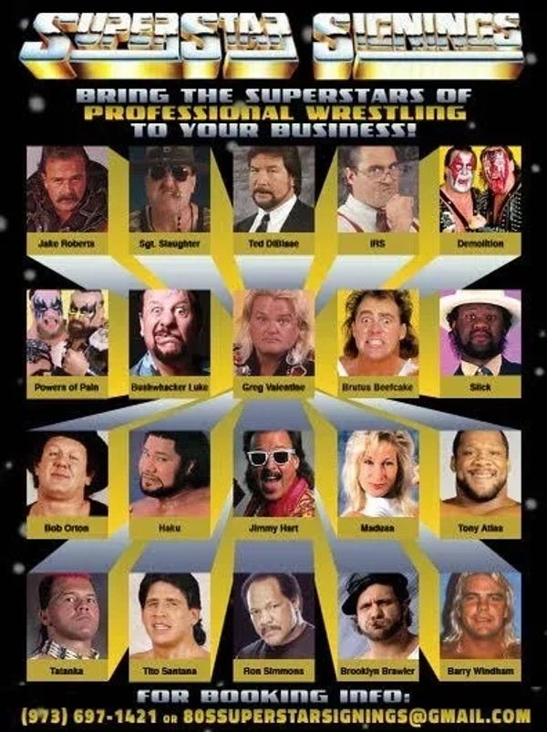 Bring the Superstars of 80’s Wrestling to your next promotion or event! For more info, call (973) 697-1421 or Email 80sSuperstarSignings@gmail.com